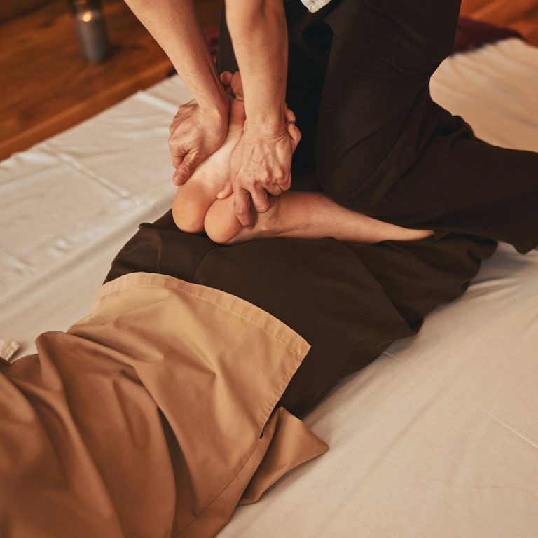 Die Traditionelle Thai-Massage ist eine Kombination aus Akupressur, Dehn- und Drucktechniken, die mit Daumen, Handflächen, Ellenbogen und Knie ausgeführt werden.